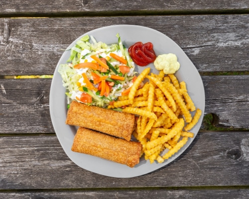 Kæmpe forårsruller med tilbehør serveres med flade kartofler og klassisk béarnaisesauce.Tilbehør: frisk salat med bl.a. ærter, majs, tomat og agurk.Serveres med brød og creme fraiche.