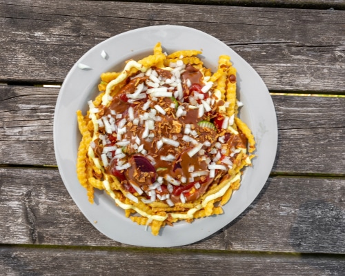 MøllehjulEn saftig, hjemmelavet bøf med pommes frites i bunden . Med ketchup, remoulade og sennep, og toppet med både friske rå løg og sprøde ristede løg. Hertil syrlige rødbeder, klassisk agurkesalat og masser af cremet brun sovs – ud over det hele. Et ægte skud dansk komfortmad!