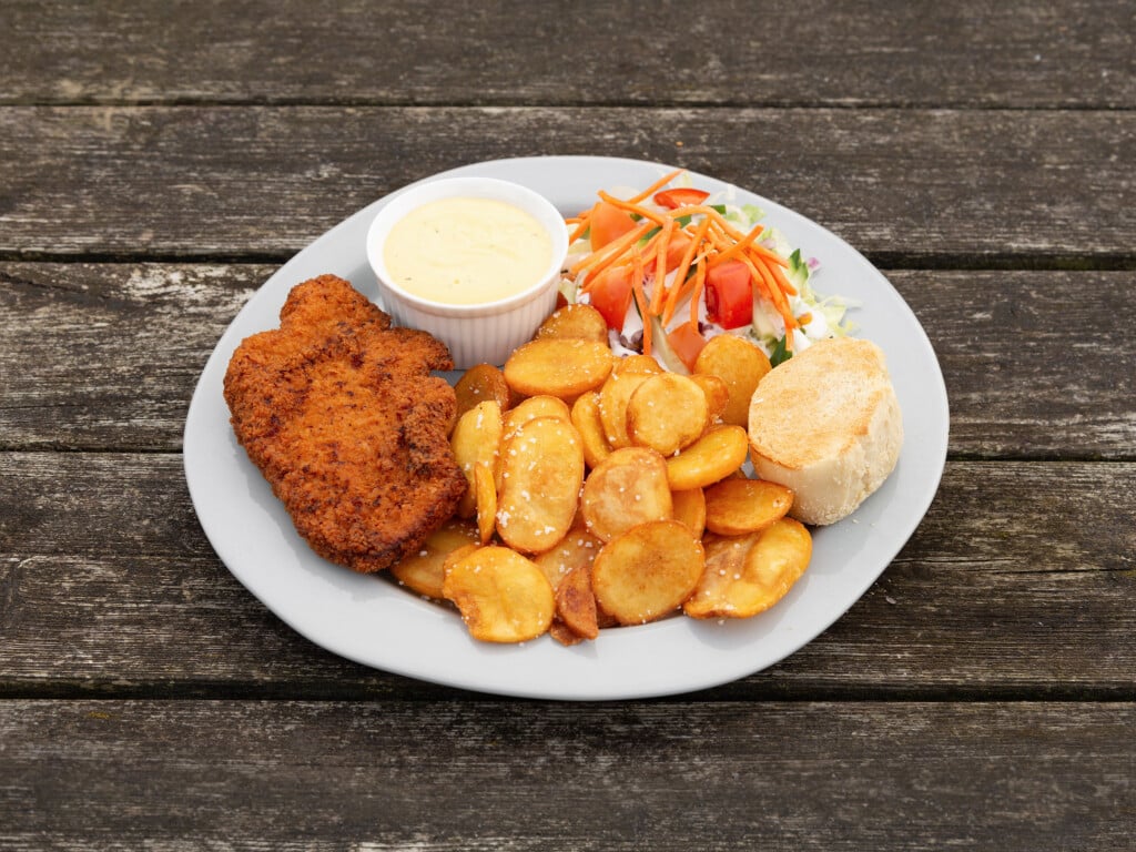 Schnitzel m/ tilbehør serveres med flade kartofler og klassisk béarnaisesauce.Tilbehør: frisk salat med bl.a. ærter, majs, tomat og agurk.Serveres med brød og creme fraiche.