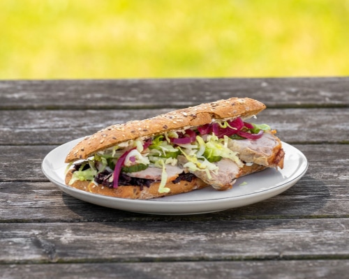 FlæskestegssandwichMørkt subbrød med drys, fyldt med flæskesteg med sprød svær, hjemmelavet agurkesalat, masser af friske grøntsager og god smag i hver bid.